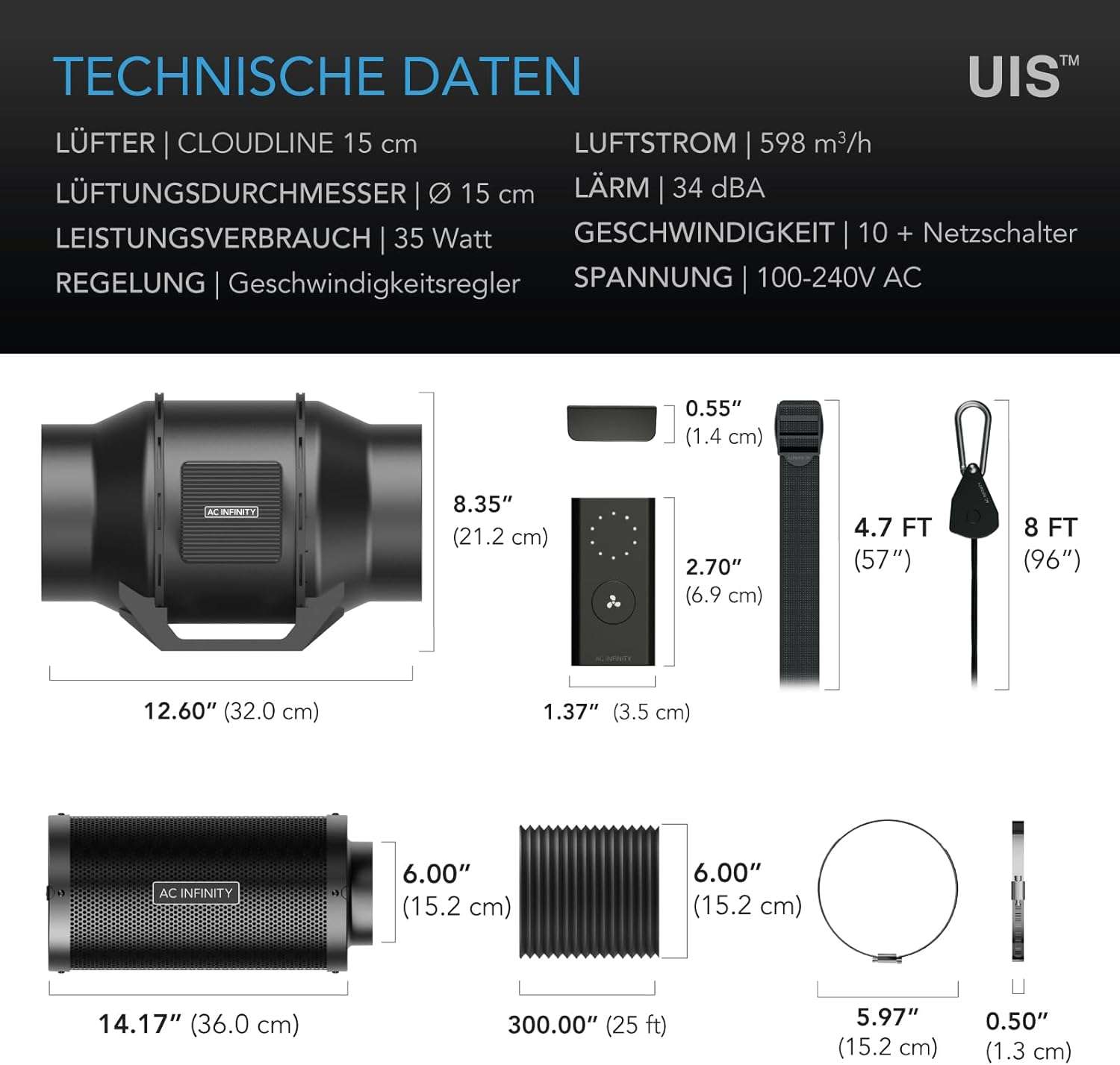 Der im Set enthaltene CLOUDLINE Inline-Ventilator arbeitet leise und effizient, ausgestattet mit einem 10-stufigen Geschwindigkeitsregler. Dank seines Mischstromdesigns liefert er einen starken Luftstrom selbst bei restriktiven Bedingungen. Ergänzt wird er durch den 38 mm starken Aktivkohlefilter aus australischer Premium-Kohle (1200+ IAV), der zuverlässig verhindert, dass unerwünschte Gerüche nach außen dringen. Der vierlagige Luftschlauch (7,6 m) sorgt für sicheren, reißfesten und luftdichten Transport der Abluft.